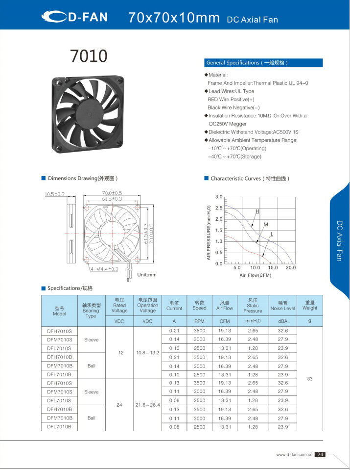 材料: 框架和葉輪:熱塑UL 94-0 引線.UL類型 紅色導線正極(+) 黑線負極(-) 絕緣電阻:10MΩ或以上,帶DC250V高阻表 介電耐壓:AC500V 1S 允許環(huán)境溫度范圍: -10℃-+70℃(運行) -40℃-+70℃(儲存)